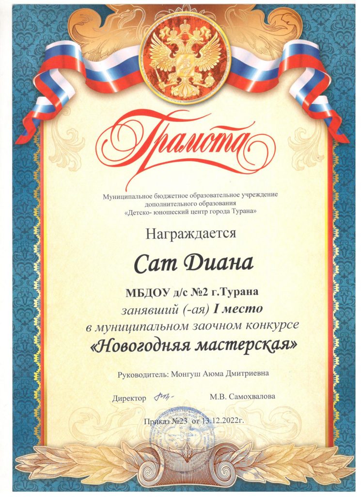 Без рубрики Воспитанница подготовительной группы Сат Диана приняла участие в муниципальном заочном конкурсе «Новогодняя мастерская «. Ее работа заняла первое место. Молодец! 29.12.2022 /